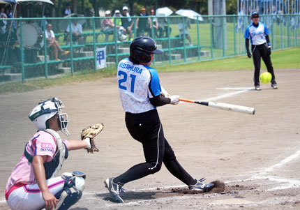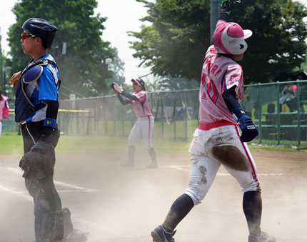 《本》:本塁打 《三》:三塁打 《二》:二塁打 | 「第58回日本女子ソフトボールリーグ」交流節は、富山県富山市・岩瀬スポーツ公園ソフトボール広場を会場に開催され、前半戦の成績をもとに「プラチナセクション」1位・3位・5位のチームは、「サファイアセクション」2位・4位・6位のチームと、「プラチナセクション」2位・4位・6位のチームは、「サファイアセクション」1位・3位・5位のチームと、それぞれ3試合を行う試合方式が採用されている。 大会初日(7月4日/金)A球場第2試合は、この日の第1試合で「サファイアセクション」2位のVONDS市原 Emerald Greenに1-4の逆転負け。通算成績4勝2敗となった靜甲と、前半戦終了時点で2勝3敗、「サファイアセクション」4位の平林金属 Peachblossomsが対戦した。 先手を取ったのは靜甲。初回、平林金属 Peachblossoms・先発の伊藝優良の立ち上がりを攻め、四球、内野ゴロ、ワイルドピッチ、四球、盗塁で一死二・三塁とし、4番・小黒美空がキッチリとレフトへ犠牲フライを打ち上げ、三塁走者を迎え入れ、1点を先制。続く2回表にも6番・土屋亜友未のフェンス直撃の三塁打から追加点のチャンスをつかみ、7番・西村雛のライト前に落とすタイムリーで2点目。このまま靜甲のペースで試合が進むかと思われた。 しかし、その裏、平林金属 Peachblossomsが猛反撃。靜甲・先発の望月ひよりをとらえ、5番・岡田望、6番・森香央理の連打、送りバントで一死二・三塁とし、8番・三田南菜の一・二塁間を抜くタイムリーでまず1点。一塁走者が盗塁し、再び二・三塁と攻め立て、9番・原陽羅がヒットエンドランを決め、同点。さらに1番・大山秋歩にもタイムリーが飛び出し、この回3点を奪い、3-2と逆転に成功した。 ![]() (※平林金属 Peachblossomsは2回裏、怒涛の攻めで一気に逆転!) これで今度は平林金属 Peachblossomsに試合の流れが傾いたかと思われたが、靜甲はその直後の3回表、二死走者なしから4番・小黒美空、5番・山本佳世、6番・土屋亜友未、7番・西村雛の4連続長短打で3点を挙げ、5-3と試合をひっくり返した。 ![]() (※靜甲は3回表、二死からの4連続長短打で3点を挙げ、逆転に成功) 靜甲はその後も攻撃の手を緩めず、5回表には3本の長短打を集め、3点を追加。6回表にも4番・小黒美空の適時二塁打で1点を追加し、終わってみれば9-4と大差をつけ、「交流戦」初勝利! この日のダブルヘッダー1勝1敗で通算成績5勝2敗とした。 敗れた平林金属 Peachblossomsは通算成績2勝4敗。序盤、劣勢に立たされながら一度は試合をひっくり返したのだが……投手陣が踏ん張れず、3投手をつぎ込む継投策も実らず12安打を浴び、9失点。大差で敗れる結果となった。 | |||||||||||||||