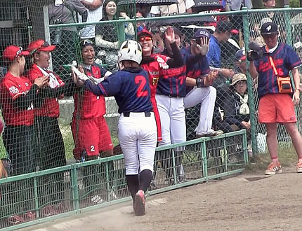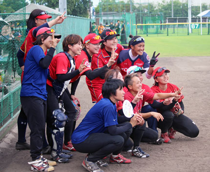 《本》:本塁打 《三》:三塁打 《二》:二塁打 | 「第58回日本女子ソフトボールリーグ」交流節は、富山県富山市・岩瀬スポーツ公園ソフトボール広場を会場に、大会最終日は例年通り、「スペシャルイベント」が開催され、第2試合ではオリンピック金メダリストを筆頭に、世界選手権(現・ワールドカップ)優勝や日本リーグで個人タイトルを獲得した「かつての名選手」を集めたレジェンドチームと、現在のJSL(日本ソフトボールリーグ)の各チームを「代表する選手」、チームの「顔」となる選手を選抜し、編成したJSLオールスターが対戦した。 JSLが現行の編成・試合方式となってから実施されている「ドリームマッチ」も、実際は「かつての名選手」とあって、当然のことながら現役時代のコンディション、パフォーマンスにはほど遠く……といったことが多々見られたが、今年はその「レジェンド」たちが、この試合を目標に、しっかりと仕上げ、「勝負」にこだわったため、例年とは一味違う展開となった。 レジェンドチームは初回、1番・増山由梨(2003世界ジュニア選手権優勝。現役時代:デンソー→タカギ北九州)がレフト線を抜く二塁打を放ち、出塁。2番・村上ほのか(現役時代:Honda→豊田自動織機)のセンター前ヒットで二塁走者が本塁突入! 現役時代には定評のあった「足」を見せてくれるかと期待されたが……三・本間で挟まれ、タッチアウト。三・本間でのランダウンプレーの間に打った村上ほのかが三塁まで進み、次打者への投球中、バッテリーの一瞬の隙を突き、ディレードスチールから「ホームスチール」を敢行。キャッチャーがピッチャーに返球する間に、三塁走者が本塁を陥れるプレーで初回に1点を先制した。 ![]() (※レジェンドチームが今年の「本気」を示し、村上ほのかのホームスチールで先取点!) 1−1の同点で迎えた4回表、レジェンドチームは4番・山﨑早紀(東京2020オリンピック金メダリスト。現役時代:トヨタ自動車)がショート内野安打で出塁し、猛攻の口火を切ると、4本の長短打を集中させ、一挙4点を奪い、5−1と大きくリードを奪った。 その裏、JSLオールスターは一死から安打で走者を出しながら、併殺でチャンスを潰し、無得点に終わったところで制限時間を迎え、レジェンドチームが5-1で勝利。この対戦が企画されるようになってから「初」の勝利を手にした。 先発・坂井寛子(2008北京オリンピック金メダリスト。戸田中央→太陽誘電)、尾崎望良(元・日本代表。現役時代:太陽誘電)、阿南恵子(現役時代:豊田自動織機)と3投手つぎ込む投手リレーでJSLオールスター打線を初回の1点のみに抑え、5-1で快勝した。 ![]() (※「ドリームマッチ」を実施するようになって「初勝利」を挙げたレジェンドチーム) | |||||||||||||||