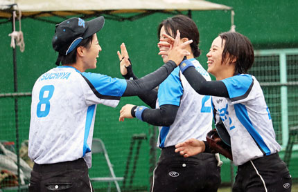 《本》:本塁打 《三》:三塁打 《二》:二塁打 | 「第58回日本ソフトボールリーグ」第4節・プラチナセクションは栃木県大田原市・美原公園第2球場を会場に開催され、第2日・第1試合は雨の中での試合となり、通算成績9勝2敗で「単独首位」に立つ靜甲と、ここまで8勝3敗の「同率2位」MORI ALL WAVE KANOYAの「直接対決」「首位攻防戦」を迎えた。 後攻の靜甲は初回、MORI ALL WAVE KANOYAの先発・猩々紫月の立ち上がりをとらえ、1番・伊藤茉奈が二遊間を抜く安打で出塁。2番・井上葉菜も二遊間を破る安打で続き、一塁走者・伊藤茉奈が俊足を飛ばし、一気に三塁まで進塁。「スピードスター」伊藤茉奈をトップバッターに据え、2番に「主砲」井上葉菜を置くという「超攻撃型」の打順の組み換えが当たり、1・2番の連打でいきなり先制のチャンスをつかみ、3番・小黒美空の空振り三振となる投球がワイルドピッチとなり、三塁走者が生還。まず1点を先制し、なお一死二塁のチャンスが続き、二死後、5番・山本佳世がレフト前へのタイムリーを放ち、二塁走者が還り、この回2点目。この試合のために用意した「スペシャルオーダー」が機能し、初回に2点を先制した。 勢いに乗る靜甲は2回裏にも、安打、犠打、敵失、死球等で二死満塁とし、3番・小黒美空が満塁の走者を一掃する適時三塁打。今シーズン「打線の中軸」に抜擢され、活躍を続けてきた「ルーキー」が、今シーズンを象徴するかのような「働き」を見せつけ、この回3点を追加し、5-0と大きくリードを奪った。 一方、MORI ALL WAVE KANOYAは靜甲の「エース」小井沼美月の前に3回まで無得点に抑えられていたが、4回表にようやく反撃。一死から3番・福元彩未がレフトスタンドに運ぶソロホ―ムランを放ち、反撃に転じるかと思われたが……5回表、6回表と三者凡退。最終回、一死から4番・竹原由菜がレフト前ヒットを放ったものの、後が続かず、結局、得点は福元彩未のソロホ―ムランによる1点のみ。1-5で敗れ、手痛い4敗目。通算成績8勝4敗となり、「連覇」へ黄信号が灯る結果となった。 ![]() (※MORI ALL WAVE KANOYAは4回表、福元彩未が本塁打を放ち、反撃開始かと思われたが……。画像提供:JSL) 勝った靜甲は10勝2敗。最終戦を残しているが、この試合に勝利したことで靜甲のプラチナセクション「1位通過」が決定(靜甲が最終戦を落とし、3敗目を喫し、3敗で並ぶ可能性のある大和電機 Blue Lakersが残り試合を「全勝」し、「同率」で並んだとしても、靜甲が大和電機 Blue Lakersとの「直接対決」に連勝しているため、リーグ規程により、靜甲の順位が上となる)。 ![]() (※雨中の激闘を制し、プラチナセクション「1位通過」が決定した靜甲。画像提供:JSL) また、この日予定された第2試合・第3試合は悪天候のため、「予備日」(10月13日/月・祝)に順延されることになり、試合実施順の変更や消化試合数の違いによって、順位決定の行方はより「微妙で複雑な状況」になってきた。 | |||||||||||||||