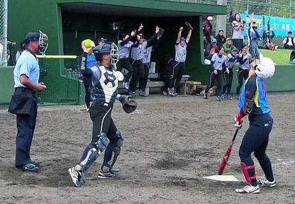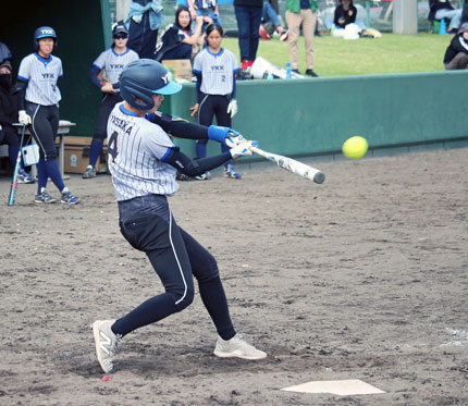《本》:本塁打 《三》:三塁打 《二》:二塁打 | 「第58回日本女子ソフトボールリーグ」順位決定節は、大会初日(10月31日/金)悪天候のため、雨天・順延となった試合が、この日(11月2日/日)実施された。 「プラチナセクション」1位・2位、「サファイアセクション」1位・2位のチームにより「日本リーグ優勝」が争われる「順位決定節」Aブロック。4チームによる1回総当たりのリーグ戦2日目・第2試合は、前日(11月1日/土)のダブルヘッダーに連敗。この日の第1試合でVONDS市原 Emerald Greenが、ここまで「全勝」の靜甲を破ったことで「優勝決定戦」進出の可能性が消滅した(靜甲が3戦全勝となり、他の3チームが1勝2敗の2位に並ぶ可能性がなくなった)「サファイアセクション」1位・YKKと、前日の「プラチナセクション」1位・靜甲との対戦に0−7と完敗した「プラチナセクション」2位・大和電機 Blue Lakersが対戦した。 先攻のYKKは初回、大和電機 Blue Lakers・先発の斉藤未来の立ち上がりをとらえ、1番・東郷佑実がセンター前ヒットを放ち、出塁。犠打で確実に走者を進めた後、3番・宮坂佑希が二遊間を抜くタイムリー! まず1点を先制し、相手守備の乱れもあり、さらに1点を追加。初回に2点を先制した。 ![]() (※YKKは初回、宮坂佑希のタイムリー等で2点を先制!) 「優勝決定戦」進出には、残り2試合「連勝」が絶対条件であり、この試合を落とすと、その可能性が消滅してしまう大和電機 Blue Lakersもすぐに反撃。その裏、YKKの先発・室山凛を攻め、3番・矢﨑月菜が死球で出塁すると、すかさず盗塁。得点圏に走者を進め、4番・新海雪奈が右中間へタイムリー! 二塁走者を迎え入れ、1点を返した。 YKKはその直後の2回表、四球で出塁した走者が2つの内野ゴロの間に三塁まで進み、1番・東郷佑実がセンター前へタイムリーを放ち、1点を追加。3-1と再び2点差にリードを広げた。 「後がない」大和電機 Blue Lakersも必死の反撃。3回裏に相手守備の乱れに乗じて1点を返し、再び1点差に詰め寄り、続く4回裏には四球で出塁した走者が二盗、三盗を決め、三塁まで進塁すると、8番・宮崎遥希がヒットエンドランを決め、三塁走者が生還。3-3の同点に追いつき、試合を振り出しに戻した。 しかし、それも束の間、3−3の同点に追いついた直後の5回表、YKKが安打、敵失等で一死二・三塁のチャンスをつかみ、6番・前田あみのセカンドゴロの間に三塁走者が還り、4−3と1点を勝ち越し。最終回にも一死から4番・大内麻里奈が右中間三塁打。この試合、5番に入った「監督兼任」の青木千秋がライトフェンス際まで運ぶ犠牲フライを打ち上げ、三塁走者を迎え入れ、5−3と2点のリードを奪った。 「優勝決定戦」進出に「執念」を燃やす大和電機 Blue Lakersも最後まで粘り、9番・古賀藍奈がピッチャー強襲安打で出塁。すかさず二塁盗塁を仕掛け、これが捕手の悪送球を誘い、三塁まで進塁し、無死三塁。1番・原野柚希のレフトへの犠牲フライで三塁走者が還り、1点差に迫り、2番・長尾明奈がフルカウントまで粘り、四球で出塁。再び一塁走者が二塁へ盗塁し、「一打同点」の場面を作ったが……後続がショートゴロ、空振り三振に倒れ、試合終了! 4−5の1点差で敗れ、勝ち星なしで2敗目を喫し、「優勝決定戦」進出の可能性が消えてしまった。 ![]() (※「一打同点」のチャンスで「主砲」が空振り三振……思わず天を仰ぐ) 勝ったYKKは1勝2敗。すでに「優勝決定戦」進出が消えた試合で「意地」を見せたともいえるが……戦前、不安視されていた優勝争いの「経験のなさ」が露呈し、「本来の力」を発揮し切れぬまま、「3位決定戦」へ回ることになった。 | |||||||||||||||