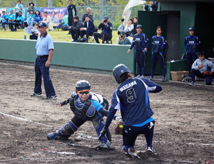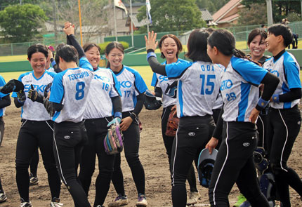 《本》:本塁打 《三》:三塁打 《二》:二塁打 | 「第58回日本女子ソフトボールリーグ」順位決定節は、初日(10月31日/金)が悪天候のため、雨天・順延となり、この日は当初予定通り、11月1日(土)に実施予定の試合が行われた。 「プラチナセクション」1位・2位、「サファイアセクション」1位・2位のチームにより「日本リーグ優勝」が争われる「順位決定節」Aブロック。まずは4チームによる1回総当たりのリーグ戦が実施され、Aブロック第1試合は、いきなり「プラチナセクション」1位の靜甲と「サファイアセクション」1位のYKKが激突する対戦カードが組まれた。 後攻の靜甲は初回、YKKの先発「日本一投球間隔が短くテンポの速いサウスポー」畑中萌の立ち上がりをとらえ、1番・土屋亜友未がショート内野安打で出塁。2番・伊藤茉奈がストレートのフォアボールで歩き、無死一・二塁。3番・井上葉菜はショートフライ(インフィールドフライ)に倒れ、一死となったが、4番・小黒美空の打席で意表を突くダブルスチールを敢行。これが見事に決まり、二・三塁とチャンスを広げ、小黒美空は四球で歩き、満塁。ここで5番・半田由佳がセンターへ犠牲フライを打ち上げ、三塁走者が生還。先取点を挙げると、なお一死二・三塁のチャンスが続き、6番・山本佳世のセンター前へのタイムリーでさらに1点を追加。初回に2点を先制した。 YKKもすぐに反撃。その直後の2回表、靜甲の先発・望月ひよりを攻め、この回先頭の5番・前田あみが左越二塁打。しかし、次打者の送りバントが靜甲守備陣のバントシフトの「網」にかかり、二塁走者が三塁タッチアウト。チャンスを逃したかに見えたが、一塁に残った走者が二塁へ盗塁。7番・青木千秋のピッチャー強襲安打で一死一・三塁とし、8番・裁さくら子がセンターへ犠牲フライを打ち上げ、三塁走者を迎え入れ、1点を返した。 ![]() (※YKKも2点を先制された後、すぐに1点を返したのだが……) YKKは4回表にも二死走者なしから6番・池川実希、7番・青木千秋、8番・裁さくら子の3連打で1点を返し、2-2の同点に追いつき、試合を振り出しに戻した。 2-2の同点に追いつかれた靜甲は5回裏、一死から1番・土屋亜友未、2番・伊藤茉奈の連打と3番・井上葉菜の四球で満塁とし、4番・小黒美空のレフトへの犠牲フライで三塁走者がホームイン! 3-2と1点を勝ち越した。 靜甲は続く6回裏にも、この回の先頭打者が安打で出塁したところで先発・畑中萌の後を受け、代わった木澤愛梨を攻め、盗塁、犠打で一死三塁とし、「代打の切り札」小田愛華がキッチリとレフトへ犠牲フライを打ち上げ、三塁走者が還り、4-2と2点差にリードを広げた。 YKKも最後まで粘り、4回途中から登板し、無得点に抑えられていた豊田彩乃を攻め、簡単に二死となった後、2番・中谷美里がライト前ヒットを放ち、出塁。3番・宮坂佑希の二遊間を抜く安打で一塁走者が一気に三塁まで進塁。一・三塁と攻め立て、4番・大内麻里奈の死球で満塁。「一打同点」「長打が出れば逆転」の場面を作ったが……5番・前田あみのショート後方へのヒット性の当たりをショート・半田由佳がよく追いつき、ガッチリキャッチ! 4-2で逃げ切り、両セクション1位のチーム同士の対決を制し、まず1勝を挙げた。 ![]() (※靜甲が4-2で逃げ切り、大事な初戦をモノにし、「1勝」を挙げた) 敗れたYKKは追撃及ばず、最終回にも「見せ場」は作ったものの、惜しくも敗れ、初戦黒星のスタートとなってしまった。 | |||||||||||||||
