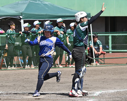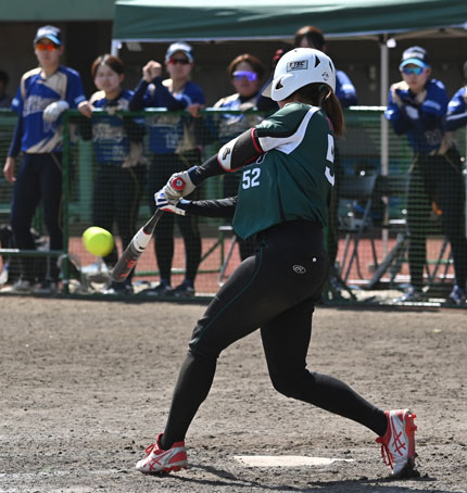 《本》:本塁打 《三》:三塁打 《二》:二塁打 | 「第58回日本女子ソフトボールリーグ」第2節・サファイアセクションは、山形県山形市・きらやかスタジアムを会場に開催され、第2日(17日/土)に実施予定の3試合が雨天のため中止・順延となり、この予備日(19日/月)に実施された。第2試合は、今節初戦のYKK戦に4-3で辛勝。しかし、2戦目の平林金属 Peachblossoms戦は4-6で敗れ、今シーズン初黒星を喫し同率首位となる「3勝1敗グループ」に飲み込まれる形となった小泉病院 Blue Arrowsと、同じく今節初戦の平林金属 Peachblossoms戦に9-4で勝利し、2戦目となったペヤング戦にも2-0と苦しみながらも辛勝。こちらも3チーム並びの「同率首位」につけているVONDS市原 Emerald Greenが対戦した。 VONDS市原 Emerald Greenは3回裏、この回先頭の1番・塚本楓花がセカンド強襲安打で出塁し、次打者の犠打で二塁へ進塁。3番・千葉春海の中前安打で一・三塁とし、一塁走者に代走・近江日和が送られ、すかさず盗塁。二・三塁とチャンスを広げると、4番・吉田汐里の三遊間を抜く適時打で先制。さらに一・三塁の場面が続き、次打者の初球で一塁走者が盗塁し、これを刺そうとした捕手が誰もいない二塁へ送球。この送球がセンターへと抜ける間に三塁走者が生還(記録は重盗)し、この回2点を先取した。 しかし、その直後の4回表、小泉病院 Blue Arrowsも反撃。この回先頭の6番・内山千彩貴が左前安打で出塁。続く7番・上田爽樺の中前安打にエラーが絡み、打球が外野地域を転々とする間に一塁走者がホームイン。打った上田爽樺も三塁まで進塁し、無死三塁の同点機を得ると、一死後、9番・野脇瑠奈の打席で初球にヒットエンドランを仕掛け、三塁走者が間一髪ホームイン! 2-2の同点に追いつき、試合を振り出しに戻した。 ![]() (※4回表、2点を返し、試合を振り出しに戻した小泉病院 Blue Arrows) 試合はそのまま最終回を迎え、小泉病院 Blue Arrowsの攻撃を無得点に抑えたVONDS市原 Emerald Greenはその裏、一死走者なしで1番・塚本楓花が打席に入り、ツーストライクと追い込まれながらの3球目を強振! 打球はセンターの頭上を越えていくサヨナラホームランとなり、3-2で「劇的勝利」! この試合に勝利し、通算成績4勝1敗でサファイアセクション「同率首位」に立った。 ![]() (※最終回、塚本楓花のサヨナラホームランでVONDS市原 Emerald Greenが「劇的勝利)) 敗れた小泉病院 Blue Arrowsは、毎回走者を出しながら得点は4回表の2点のみ。チャンスを活かしきれず惜敗。今節1勝2敗で通算成績3勝2敗の3位に順位を落とした。 | |||||||||||||||
