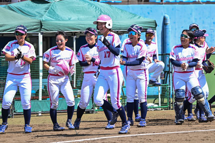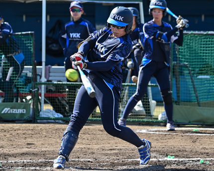《本》:本塁打 《三》:三塁打 《二》:二塁打 | 「第58回日本女子ソフトボールリーグ」第3節・サファイアセクションは、神奈川県厚木市・厚木市営玉川野球場を会場に開催され、第2日第2試合は、前日(9月6日/土)のペヤング戦で二桁10安打の猛攻で6得点を奪い、6-0の完封勝ち。通算成績4勝5敗の4位につけている平林金属 Peachblossomsと、前日のVONDS市原 Emerald Greenとの「首位攻防戦」に2-1で競り勝ち、「単独首位」に躍り出たYKKが対戦した。 後攻の平林金属 Peachblossomsは初回、一死から2番・今田弥里がYKKの先発・畑中萌の初球を引っ張り、ライトスタンドへ運ぶ先制のソロホームラン。この回1点を先制した。 ![]() (※「ルーキー」今田弥里の一発で先制した平林金属 Peachblossomsだったが……) 先制を許したYKKは直後の2回表、この回先頭の4番・大内麻里奈がレフト前ヒットで出塁し、すかさず盗塁。一死後、6番・池川実希の三遊間を破る安打で、一・三塁とし、一塁走者の盗塁で二・三塁とチャンスを広げると、7番・青木千秋がレフトオーバーのタイムリーツーベースを放ち、二者が生還。一気に逆転に成功した。 勢いづいたYKK打線は、3回表にも3番・宮坂佑希、4番・大内麻里奈の連打と盗塁等で一死二・三塁の好機をつかみ、ワイルドピッチと6番・池川実希のタイムリーで2点を追加。さらに盗塁、連続四球で一死満塁と攻め立て、9番・剣田あかね、1番・東郷佑実の連続タイムリーで2点を加え、続く2番・中谷美里のセンターへの犠牲フライで三塁走者が還り、この回5点目。なお二死一・二塁の場面が続き、ワイルドピッチと四球で再び満塁とし、4番・大内麻里奈のレフト前タイムリーで二者が還り、この回一挙7得点! 打者12人を送る猛攻で9-1とリードを広げ、勝負を決めてしまった。 ![]() (※YKKの強力打線が爆発! 3回表に大量7得点) 敗れた平林金属 Peachblossomsは「ルーキー」今田弥里の一発のみに終わり、その後は投手陣がYKK打線につかまり、最終的には10失点。通算成績4勝6敗で4位ではあるものの、一進一退の状態から抜け出せず、上位との差は広がっている。 勝ったYKKは、「自慢」の強力打線が爆発し、平林金属 Peachblossomsを圧倒!10-1で大勝し、今節連勝。通算成績8勝2敗で「単独首位」の座を守り、第3節を終了した。 | |||||||||||||||
