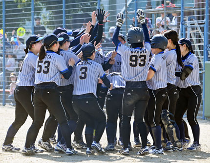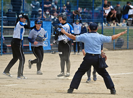 《本》:本塁打 《三》:三塁打 《二》:二塁打 | 「第59回日本女子ソフトボールリーグ」第1節・プラチナセクションは、4月18日(土)、福井県敦賀市・きらめきスタジアムで開幕を迎え、大会初日・第2試合は、昨シーズンの「覇者」であり、「連覇」を狙う靜甲 ソルフェジオ(今シーズンからチーム名を改称。「セカンドネーム」をつけた)と、昨シーズン3位、「今シーズンこそ優勝を!」と意気込むYKKが対戦した。 後攻の靜甲 ソルフェジオはYKKの先発・木澤愛梨の立ち上がりを容赦なく攻め、1番・山本佳世、2番・伊藤茉奈の連打、盗塁等で無死二・三塁の絶好の先制機をつかむと、一死後、4番・小黒美空が右中間を破る先制のタイムリースリーベース! 塁上の走者を一掃し、鮮やかな先制攻撃で初回に2点を挙げ、試合の主導権を握った。 ![]() (※靜甲 ソルフェジオは小黒美空の適時三塁打で2点を先制!) これで勢いづいた靜甲 ソルフェジオは3回裏にも3本の長短打を集中し、3点を追加。続く4回裏にも3本の長短打を集め、2点を追加。7-0と大きくリードを奪った。 一方、YKKも5回表に4安打を集中し、3点を返したものの、6回裏に再び2点を失い、最終回にも5番・前田あみがツーランホームランを放ち、追いすがったが反撃もここまで。5-9で敗れ、開幕戦を勝利で飾ることはできなかった。 ![]() (※YKKも終盤、反撃に転じたが……大量失点をはね返すには至らず) 開幕戦を勝利で飾った靜甲 ソルフェジオは「連覇」を狙う「王者」の貫録を見せ、打線が12安打・9得点と打ちまくり、「エース」小井沼美月が4回まで無失点のピッチング。後半、「強打」を誇るYKK打線の反撃を浴び、追い上げられはしたものの、先発・小井沼美月から望月ひよりへとつなぐ投手リレーで9-5で勝利を収め、「連覇」へ向け、好スタートを切った。 | |||||||||||||||