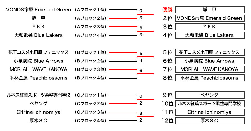 | チーム | VONDS | 厚木SC | YKK | 平林金属 | 小泉病院 | ペヤング | 勝数 | 敗数 |