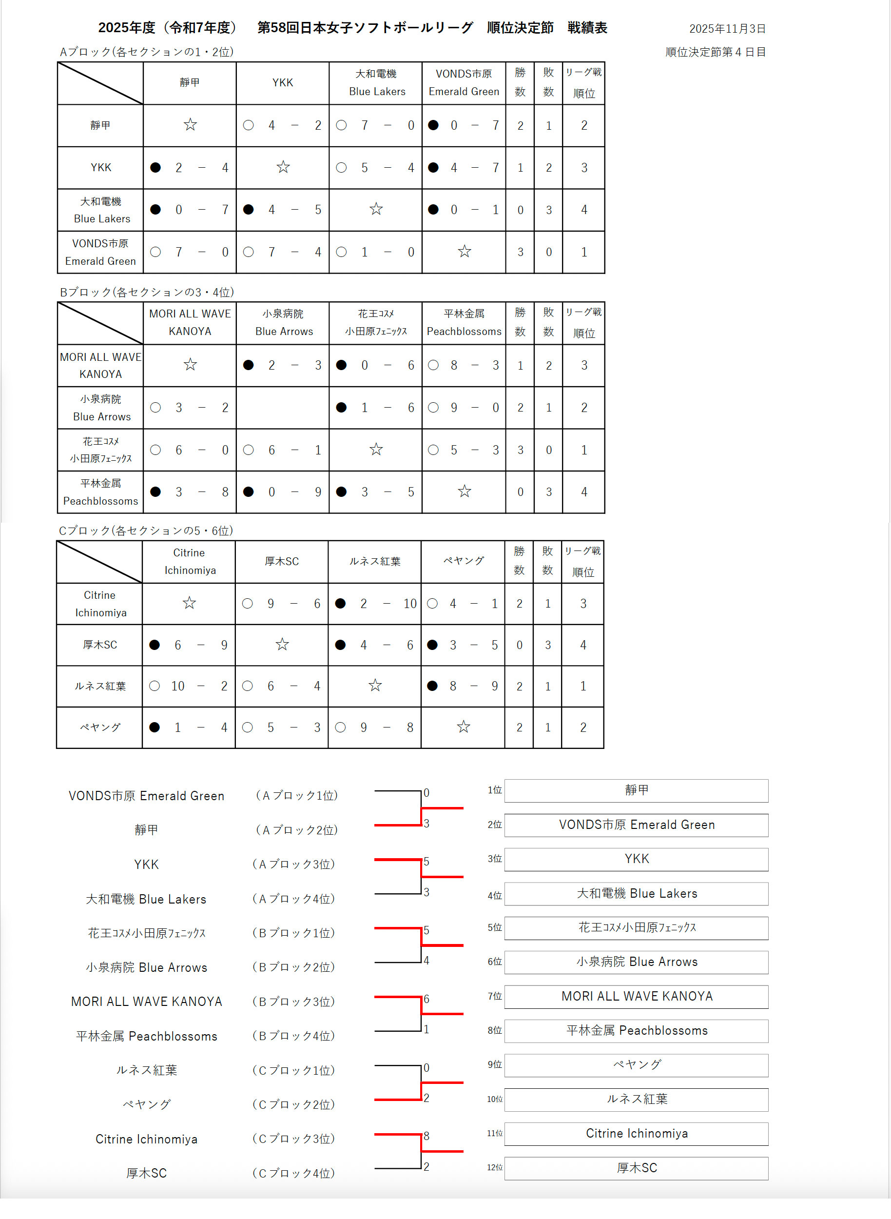 [2025年11月03日] 第58回日本女子ソフトボールリーグ順位決定節「最終結果」